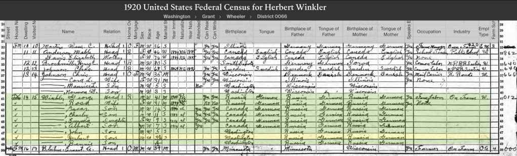 1920 Census. The family has added three more kids after moving to Washington, John, Herbert, and Benjamin. They are still living in Wheeler (Grant County) and George is a farm laborer.