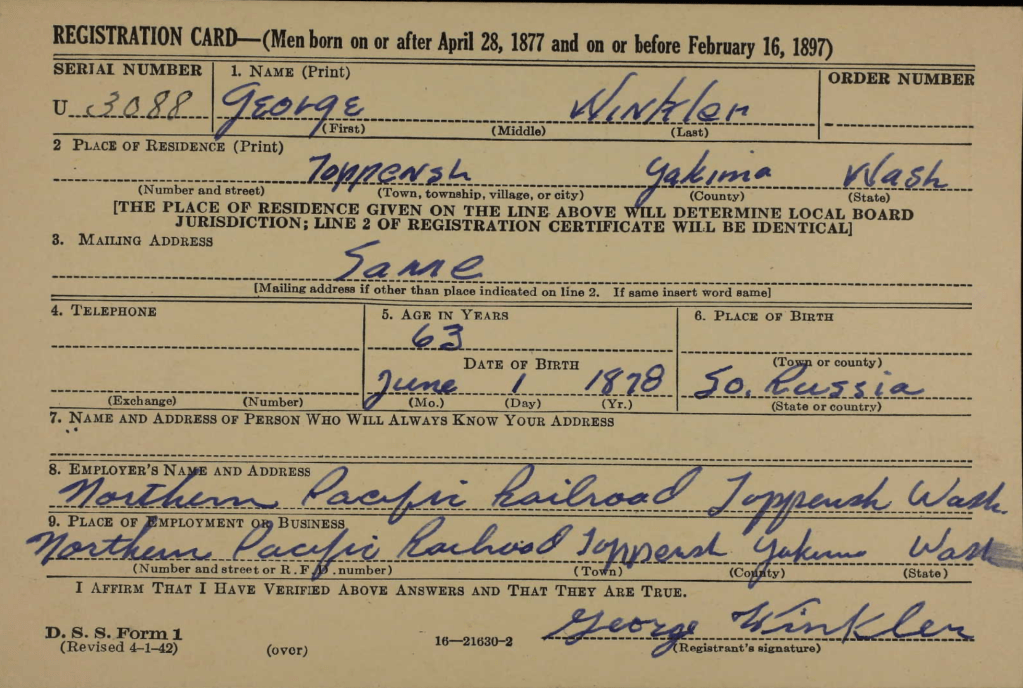 | Winkler, Johnny | Son | M, W, 16 | No | Yes | Washington | Russia | Russia | German | Yes | Laborer | Railroad | |||||
