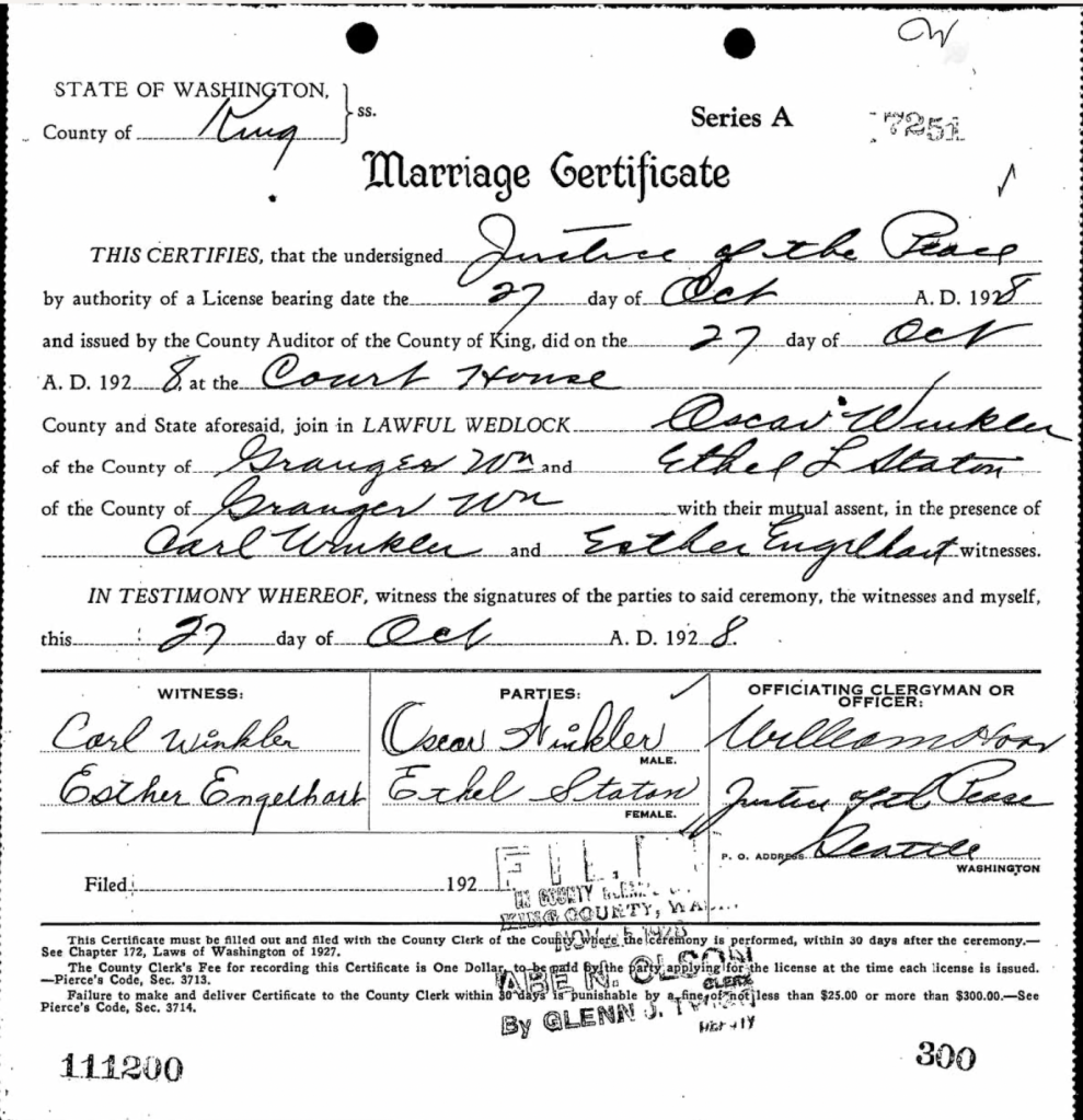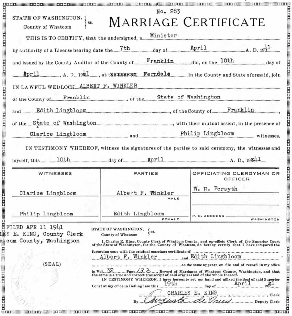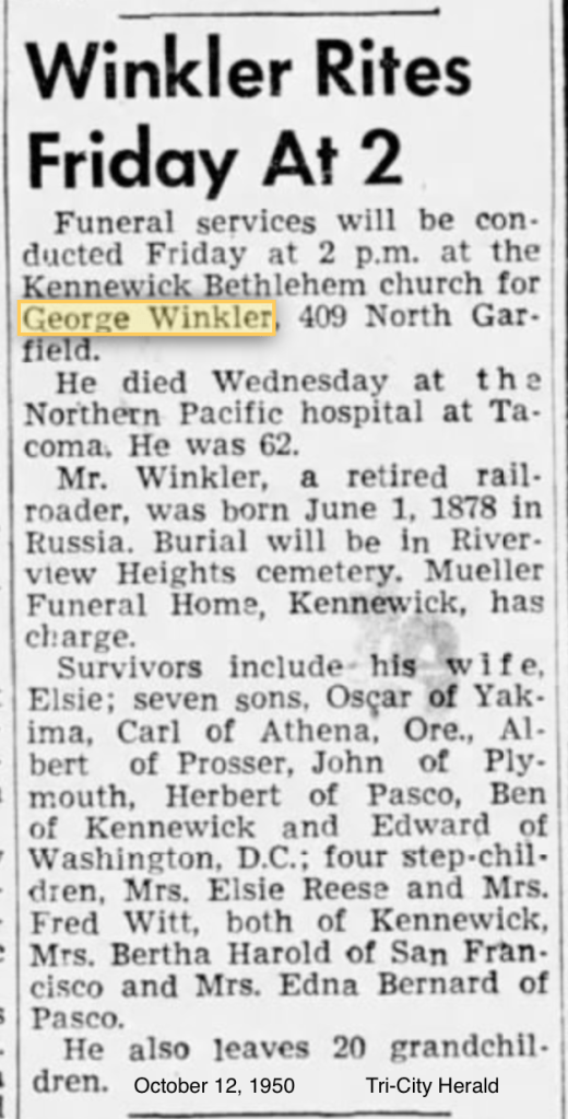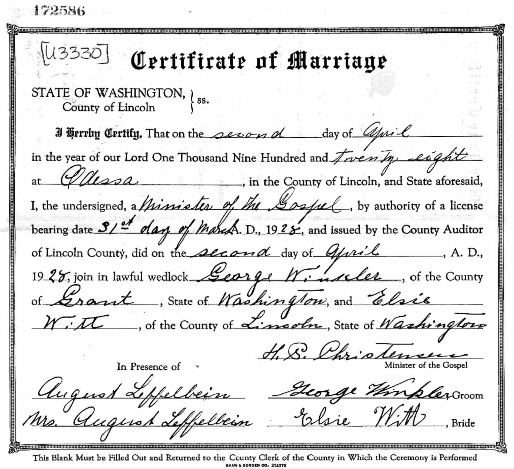 After Rosie passed away, George married Elsie Gregor (Schefsky) Witt on April 2, 1928, in Odessa Washington. She brought 4 kids into the marriage. Elsie, Fred, Berthe and Edna Witt. Now George was the father/step-father to 12 kids with 9 of them still living at home. Both George and Elsie had lost a daughter in the 1920s. Emma Winkler-11 and Maria Witt-13.