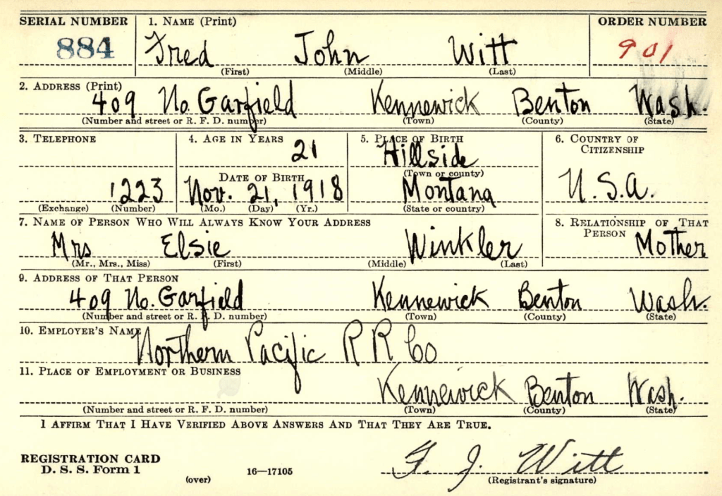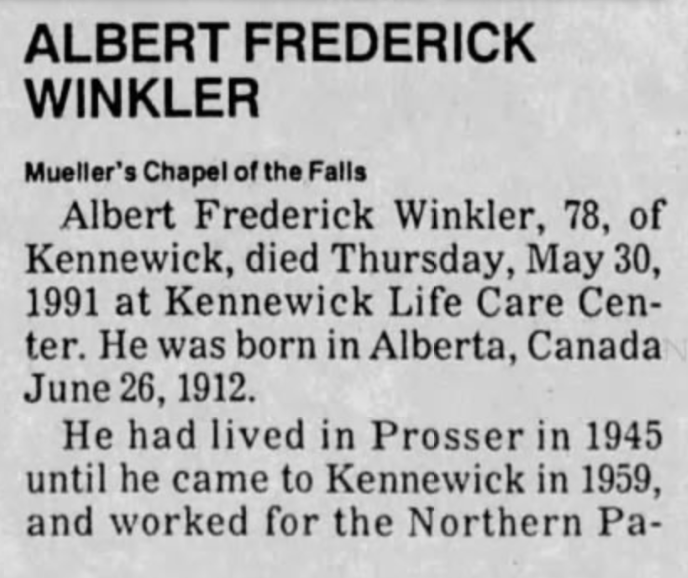 Albert Fredrick passed away in 1991 at the age of 78 in Kennewick Washington.