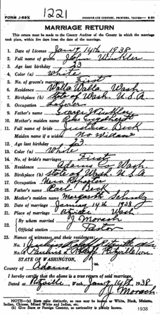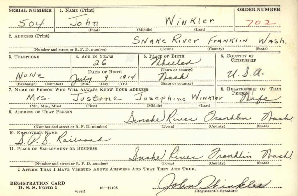 John was born to George and Rosina (Engelhardt) Winkler in Wheeler, Washington on July 9, 1914. When he was nine years old, he moved with his family to Warden, Washington., and then to Windust in 1929. As a teenager, he worked as a farmhand and laborer on the North Pacific and Spokane, Portland, and Seattle Railroad. He then spent some time with the Civil Conservation Corps beginning in 1935.