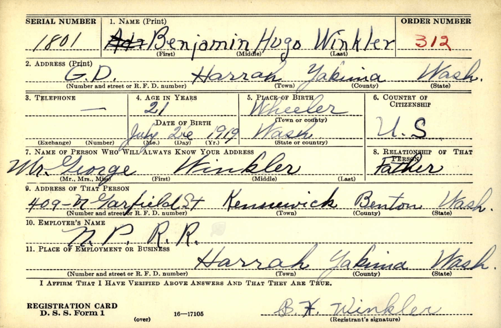 Benjamin Hugo Winkler’s 1940 WWII Registration Card