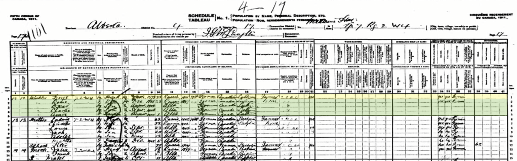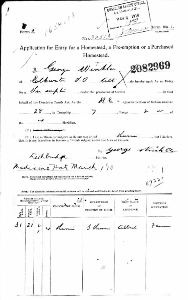 George and Rosina “Rose” Winkler are living in Alberta Canada with their children. Oscar 5, Charles “Charlie” 3, and Anise [sic] “Emma” 1-year-old were all born in Elkwater, Alberta Canada. George immigrated in 1905 and was naturalized in 1910. Rosie immigrated in 1897 and was not naturalized as of 1911. The family’s Race or Tribe is listed as German. Their religion is listed as Lutheran. George is a farmer and Rose is keeping home. Both George and Rose can read and write and their language is German.