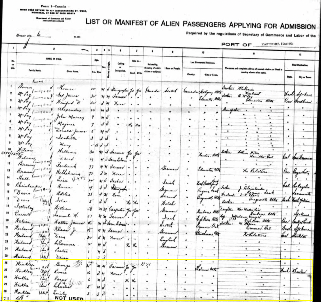 George 35, Rosie 26, Oscar 6, Charles 5, and Emily (Emma)3 years old. The bottom image is the family’s 1913 application for admission into the United States from Canada at the Port of Eastport Idaho. They do not have friends or relatives living at their destination of Wheeler, Washington. I always wonder who or what made people migrate to certain areas. It was possible it was for the farming opportunities. What made them pick Wheeler over Moses Lake? The photo above is a stock image of the Us/Canada border.