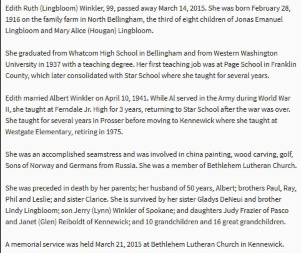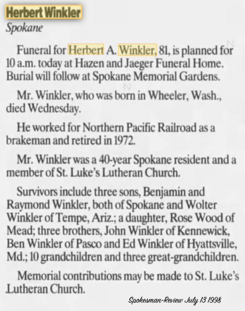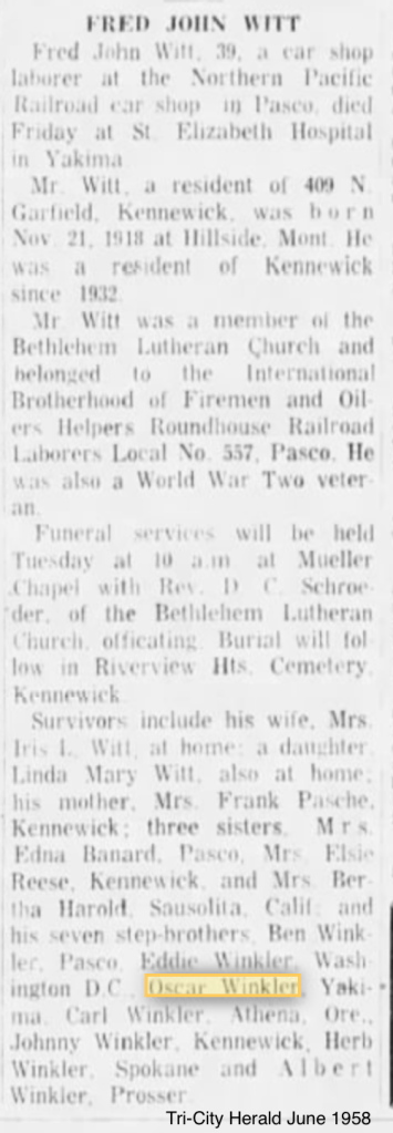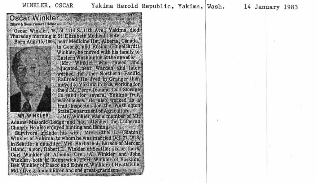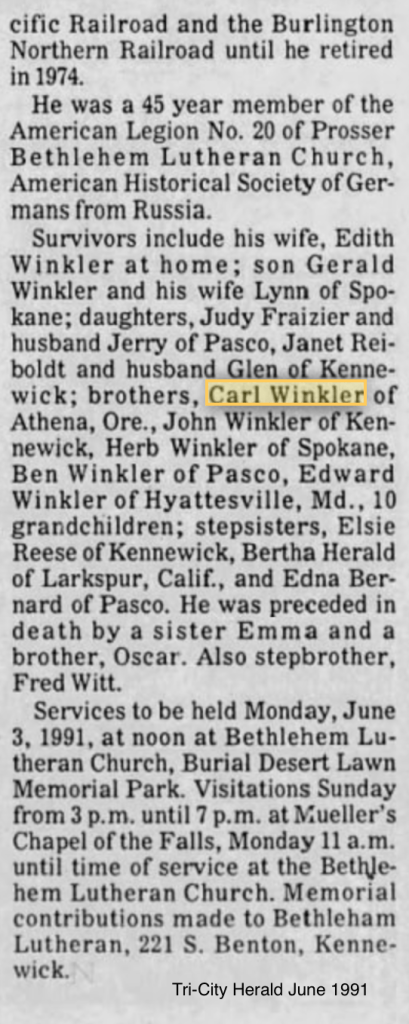He was preceded in death by his parents; stepmother, Elsie Witt Winkler, brothers, Oscar, Carl, Al, Herb, and Ben Winkler; Sister Emma Winkler and stepsister Elsie Reese and stepbrother Fred Witt.