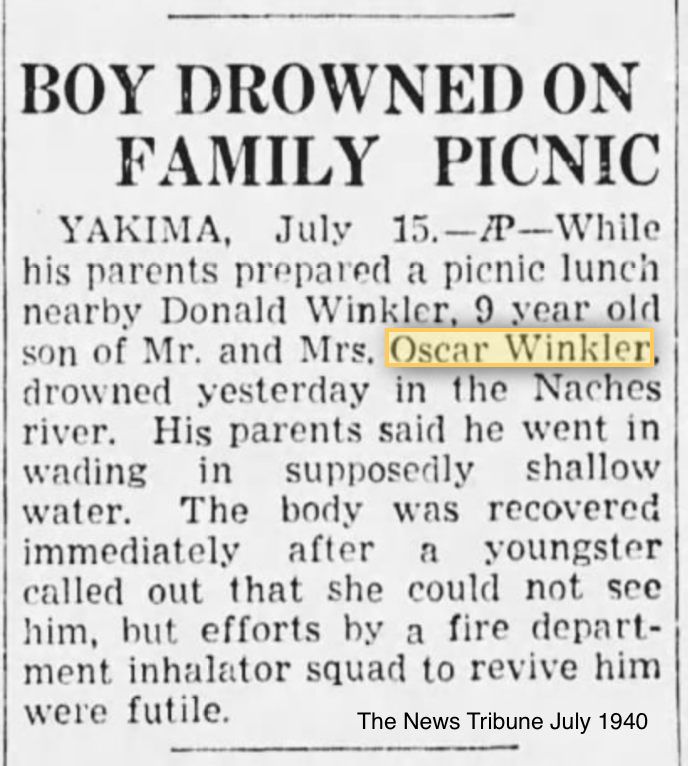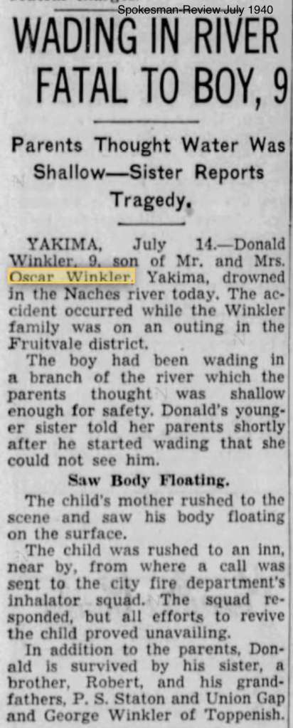 George’s grandson Donald (parents were Oscar & Ethel), dies in Yakima after wading in the Naches River and drowned. He was so young and gone too soon. Heartbreaking!