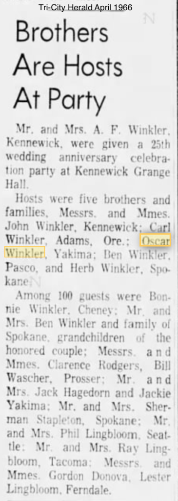 John, Carl, Oscar, Ben, and Herb hosted Albert and Edith’s 25th Anniversary at the Kennewick Grange in Kennewick Washington. April 1966
