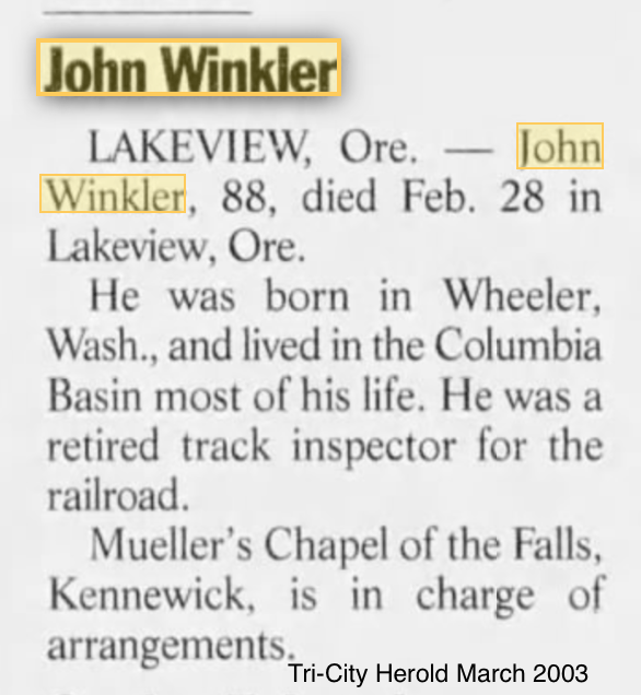 John Winkler died at the Lake District Long Term Care Facility in Lakeview, Oregon on February 28, 2003, at the age of 88. A private funeral service was held at the Desert Rose Funeral Chapel, Lakeview, Oregon on March 1, 2003, with the Rev. Charles Chase officiating.