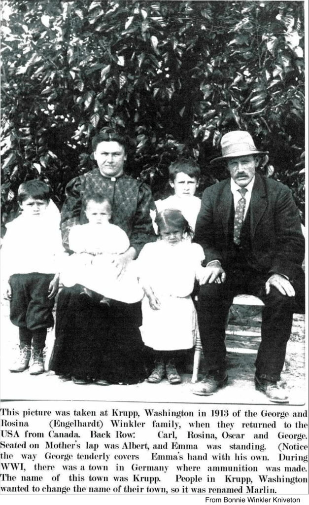 ~In 1921 at the age of 11, Emma Winkler passed away. She was born on August 26, 1910, in Elkwater, Alberta, Canada. She was the only daughter George and Rosina had. Her final resting place is at Sunset Memorial Gardens on Warden, Grant County, Washington. Section B2 Space 51.
