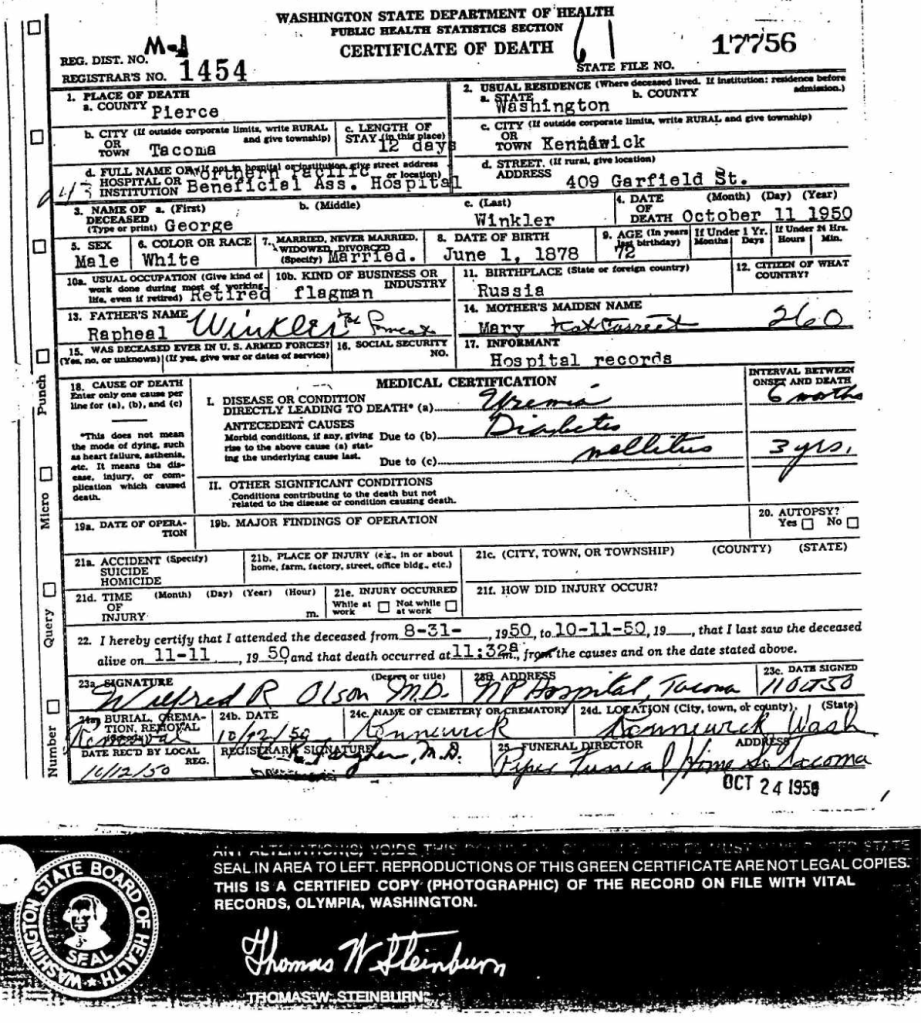 Sadly in the late 1950s, George passed away at the age of 72 in Tacoma. He is buried at Riverview Heights Cemetery, 1200 South Olympia Street Kennewick, WA 99337.