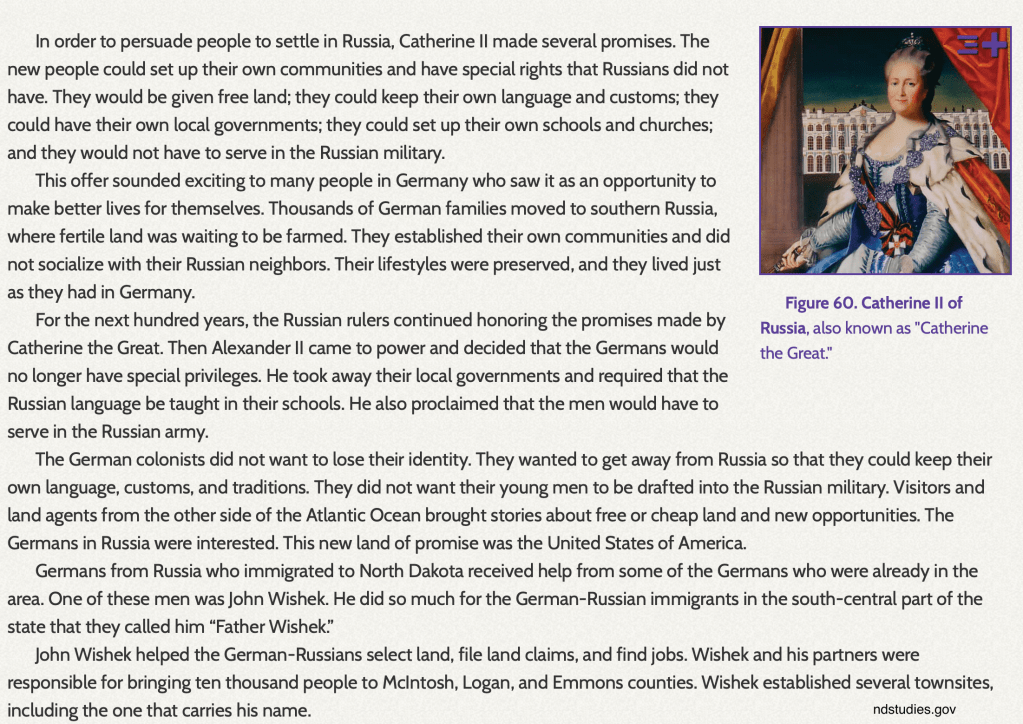The family is living in Morton, North Dakota. Prokofi and Katie have been married for 12 years. Their young son Efrem has passed away at the age of 5. It looks as if he had died on his birthday. George is 4, Frances is 1yr 4/12mos, and Barbara is 2 months old. You will notice on this census that Prokofi and Katie have their Birthplace listed as Russia, Ger. When the census takers write down their birthplace, they are required to write down the immigrant’s native tongue. Ger=German. After some research and reading on Wikipedia, It’s possible that both Prokofi and Katie’s ancestors were from Germany, and thanks to Russian Tzar Catherine ll (Catherine the Great), she gave Germans land to rebuild and farm in Ukraine after the Ottoman Empire destroyed most of it. She knew that Germans were hard-working people. Many Germans settled in Ukraine.