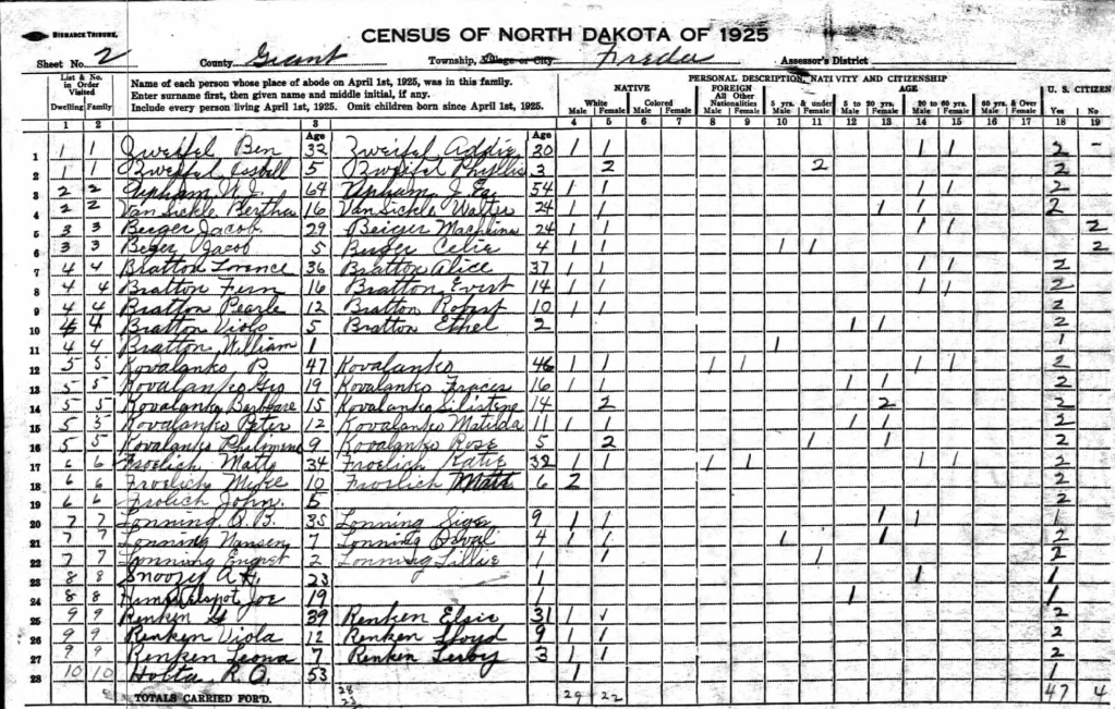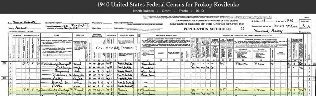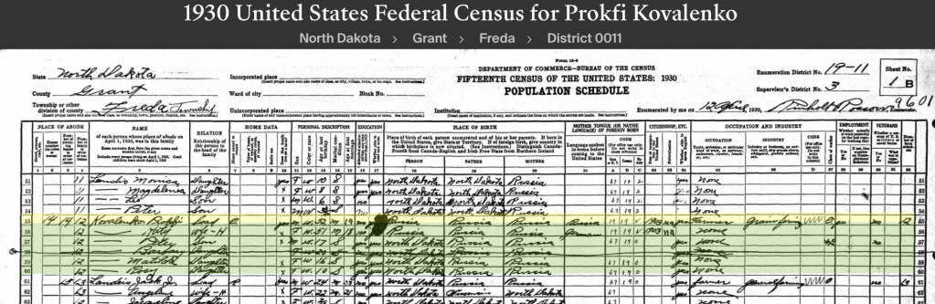 The Kovalenko’s are still in North Dakota living in Freda. The total population of the town was at its highest ever at 178 people. Peter 17, Mathilda 16, and Rose 10 are at home and attending school. I’m not sure why Barbara is scratched out? She would get married in 1932. Prokofi is 52 and Katie is 51. His native tongue is still listed as Russian and Katie’s is German. He is still farming his land. I wish they would list how many acres they were using and what they were growing.