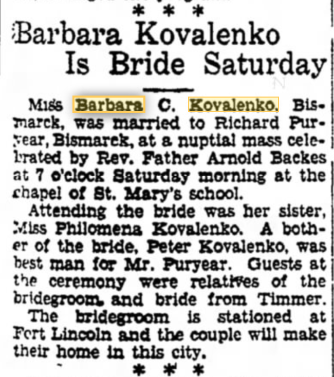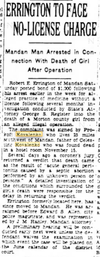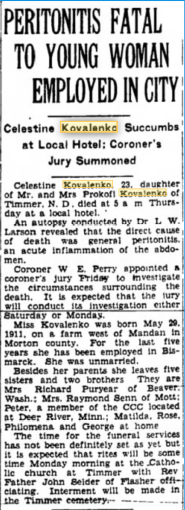 Sadly in 1934 Prokofi and Katie lost another child way too early. Celestine was 23 and working at a hotel in Bismarck, ND. The cause of death was Peritonitis (acute inflammation of the abdomen). She was unmarried. About 5 minutes after writing this I found the real cause of death (second newspaper clipping). So sad.