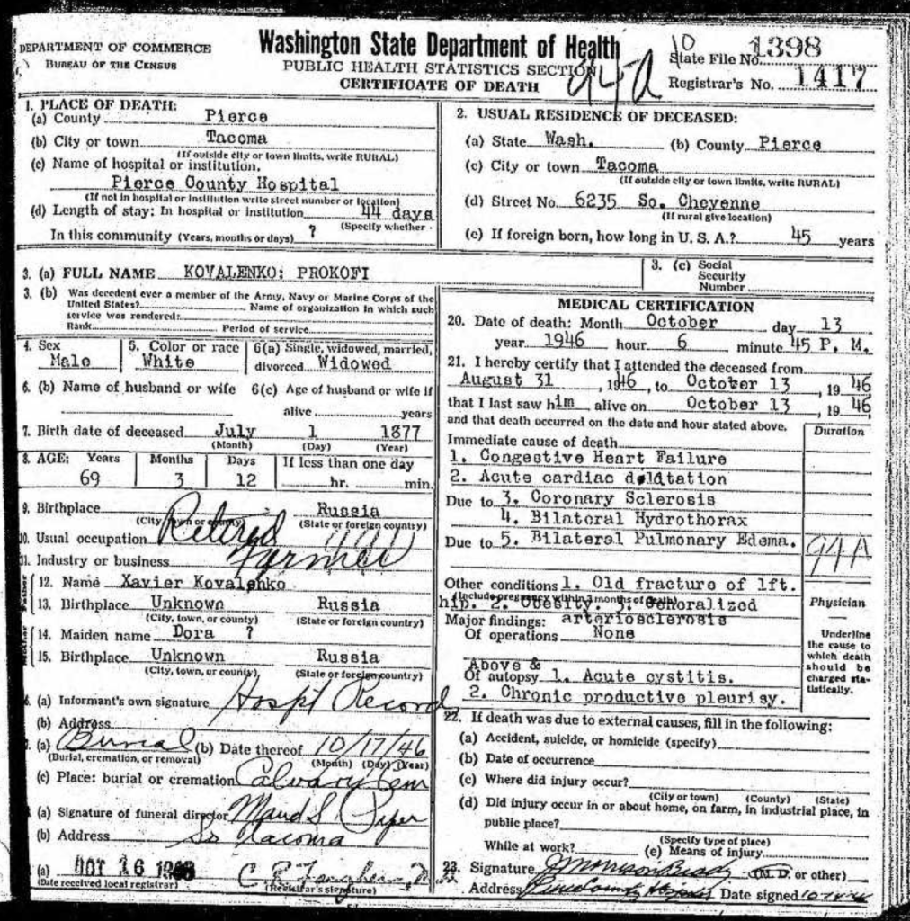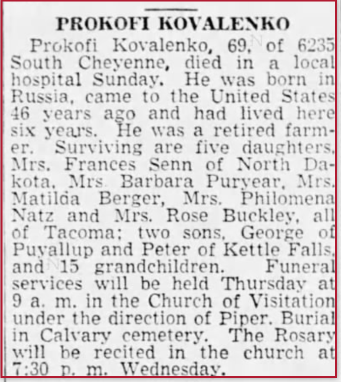 • Hi Roxanne, so you are the daughter of George Jr right? My husband Eric is the grandson of Richard Puryear (who just passed away in November) and the great grandson of Barbara Kovalenko-Puryear. Thank you so much for messaging me. I love to work on genealogy and I’m so happy you found my page. Your great grandfather Profoki is buried at the Calvary Cemetery in Tacoma along with 2 other Kovalenkos. I did not know this until I went looking there for some Puryear’s and and I saw him while I was searching. I was pretty excited. I try to do a new page every few months so if you have any stories or pictures you would like me to add, let me know. Thanks again!!