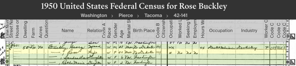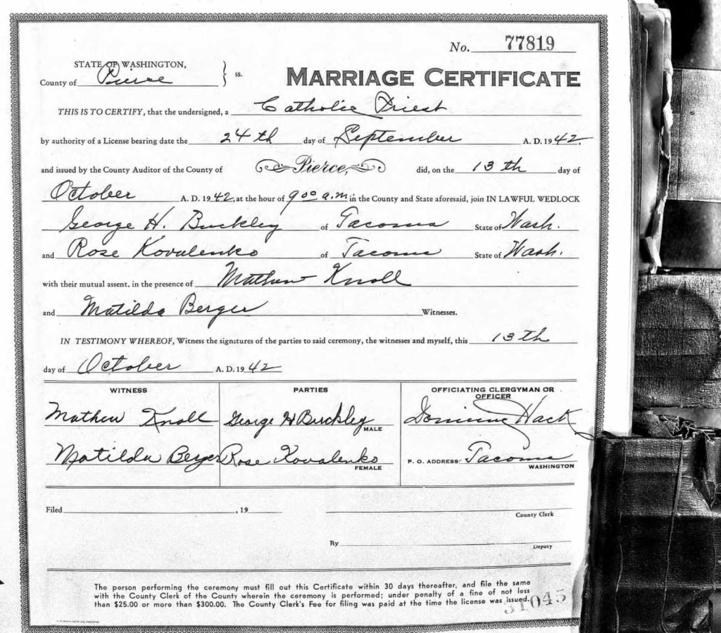 ~ Rose Marie married Mr. George H. Buckley in Tacoma, Washington on October 13, 1942. Witnesses were Matthew Knoll and Matilda Berger