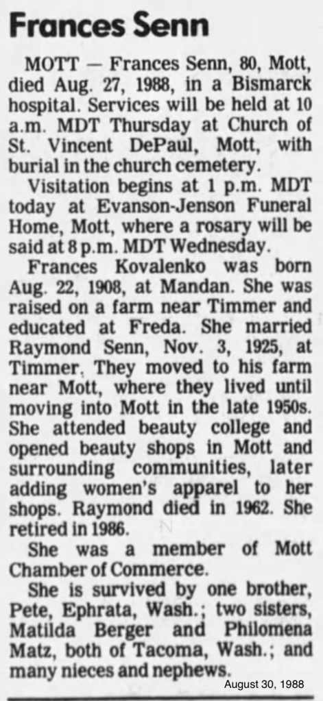 ~Frances V Kovalenko Senn passed away on August 27, 1988, in Bismarck North Dakota.