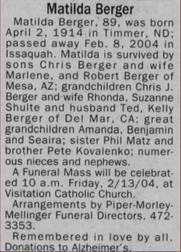 ~Matilda Kovalenko Berger passed away on February 2, 2004, in Bellevue Washington