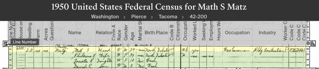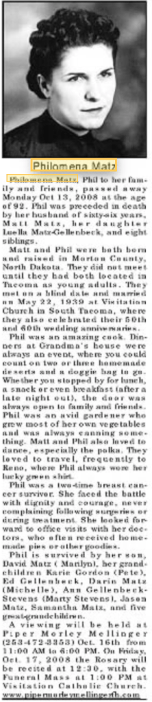 ~Philomena Catherine married Mr. Mathias S. Matz of Oliver, North Dakota, on May 20, 1939, in South Tacoma, Pierce Co. Washington. Witnesses were Richard T. Puryear and Mary Matz.