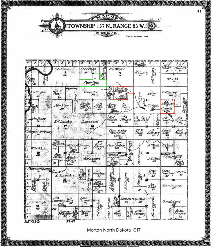 This map shows some of the land the Kovelankos owned in red and one of Katherine’s relatives Peter Paul in green
