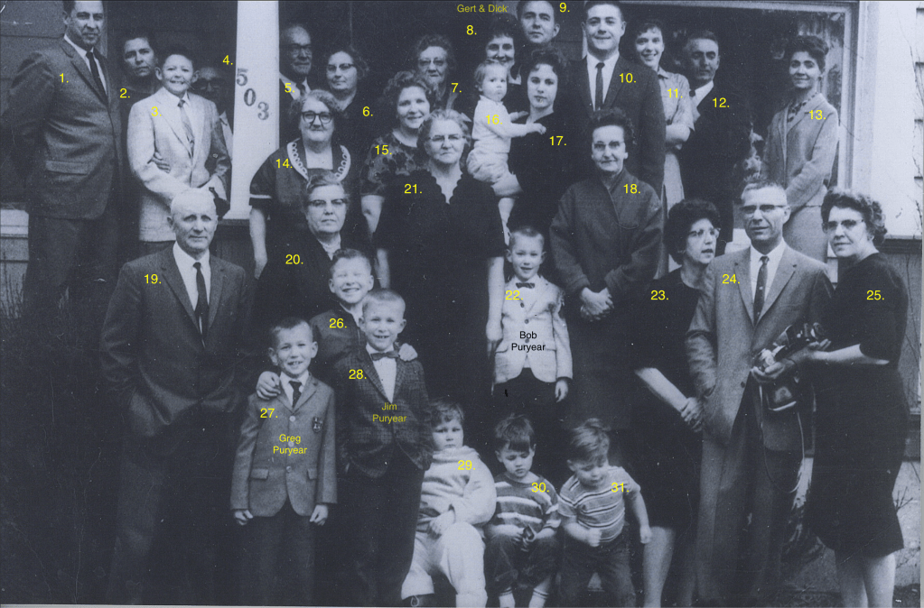 Dick Puryear thinks he remembers this being the gathering after the funeral of his Uncle George who passed away in 1963. Can you name the event and help me fill in the names. I will post this picture below without numbers on it.