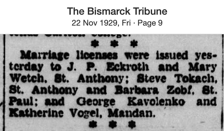 ~George Joeseph married Miss Katherine Vogel from Crown Butte, North Dakota, on November 25, 1929, in Crown Butte, North Dakota. In the 1930 census, it has them living in Morton ND, near Katherine’s family.