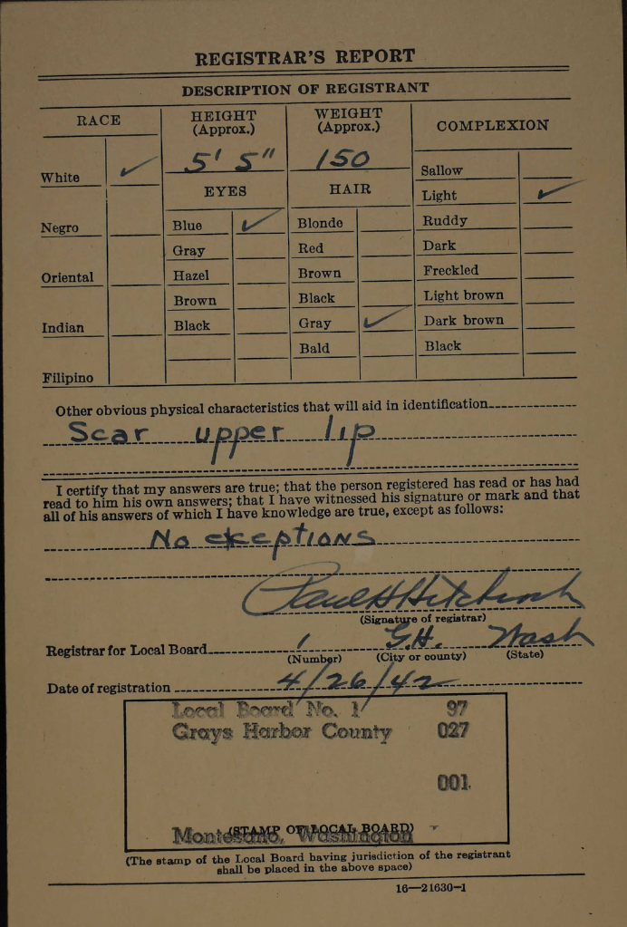 Prokofi Edward Kovalenko’s Registration Card of April 26, 1942. Prokifi was 64 years old, 5ft 5in, weighed 150 lbs, had blue eyes, grey hair, and a light complexion. He has a scar on his upper lip.
