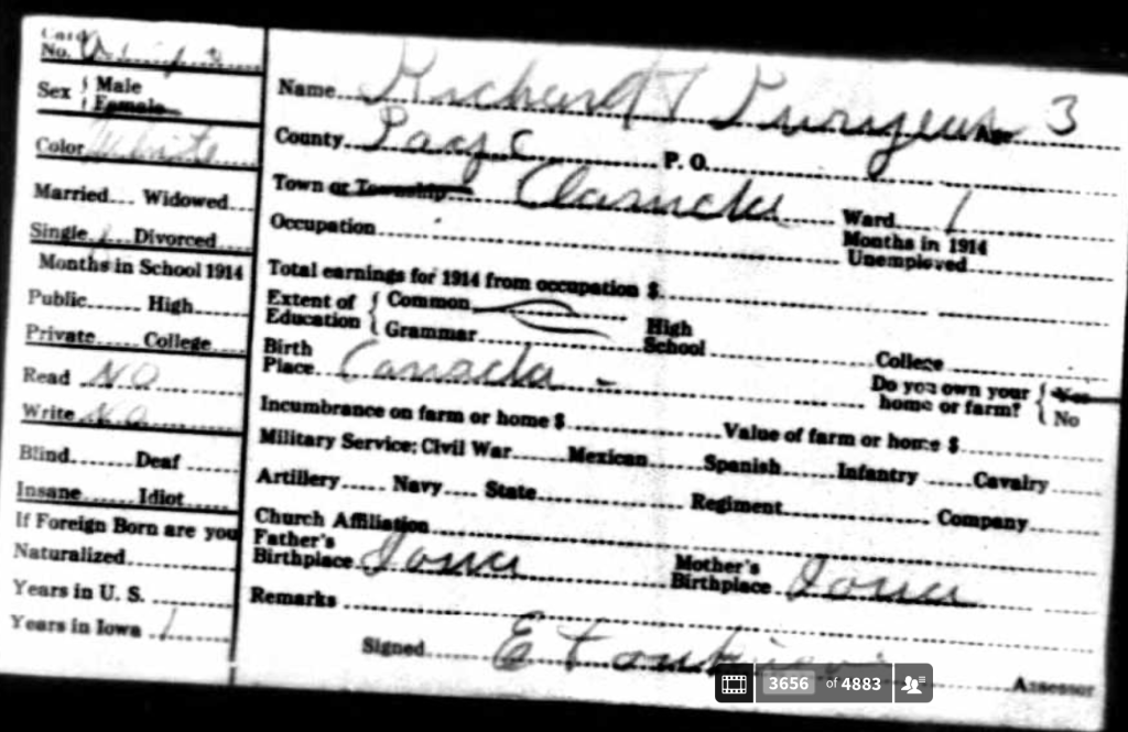 | Richard T | Son | 8/1911 | 13 | M | W | S | – | 6th, Yes, Yes, Yes | Canada US/Citz | IA | IA | – |