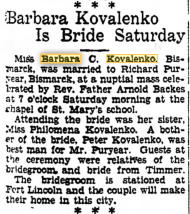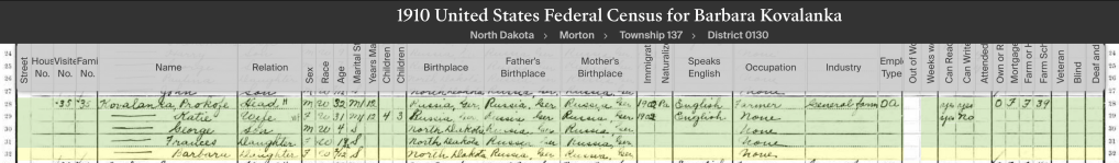 Barbara Kovalenko was born on February 27, 1910, in Custer Flat, North Dakota. She was two months old in her first census. Barbara and her two older siblings, George and Frances are the first generation in her family to be born in America.