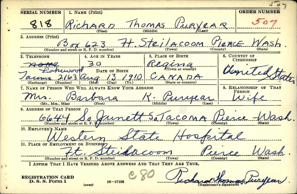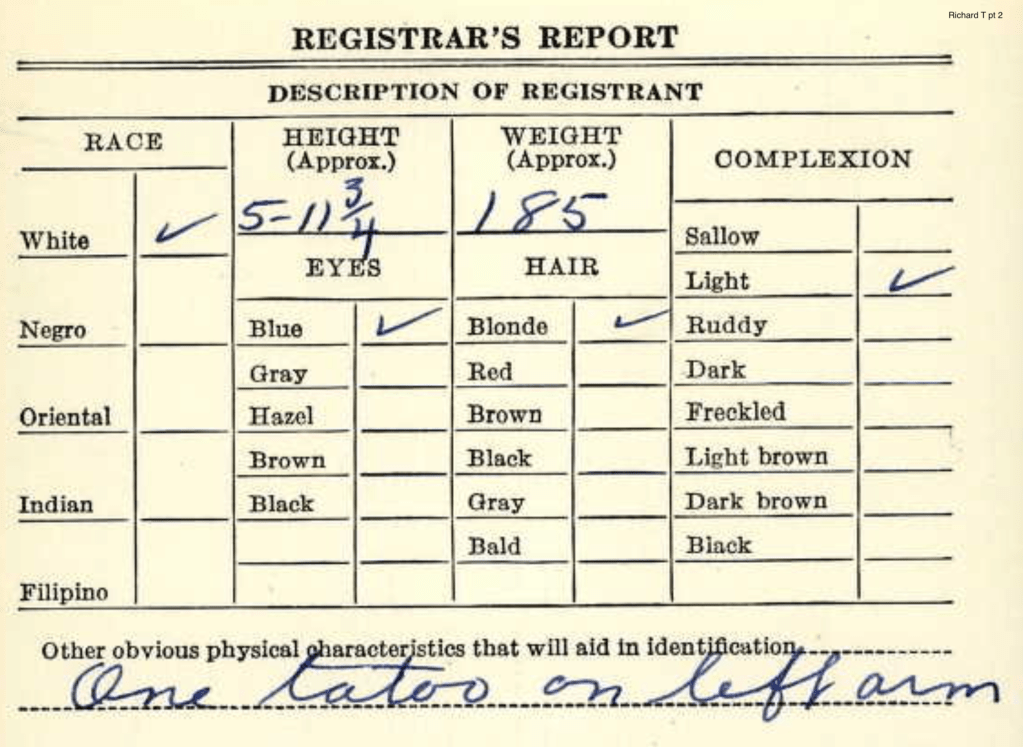 Richard was working at the Washington State Hospital in 1940. Richard Thomas was 5 ft 11 3/4, 185 lbs, blue eyes, and blond hair. He had a tattoo on his left arm.