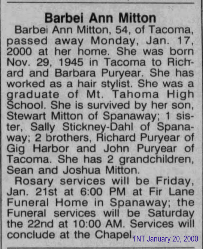 These are the only 2 articals I can find on Barbei and Stewart. Stewart died from a motorcycle crash near Eatonville in 1980. Barbei passed away at the age of 54 on January 17, 2000 in Tacoma.