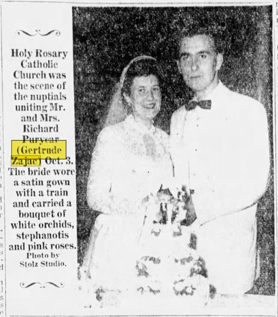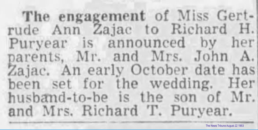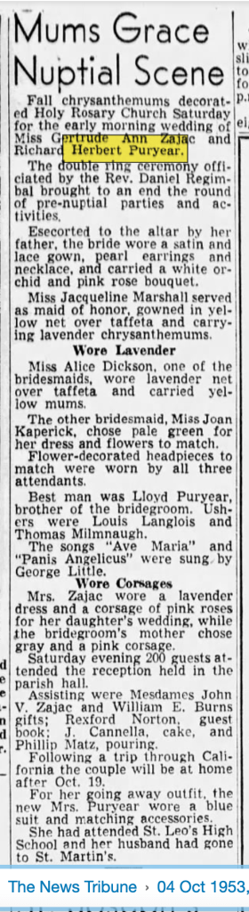 On October 4, 1953, Richard Herbert married Miss Gertrude Ann Zajac at Holy Rosary in Tacoma, Washington.