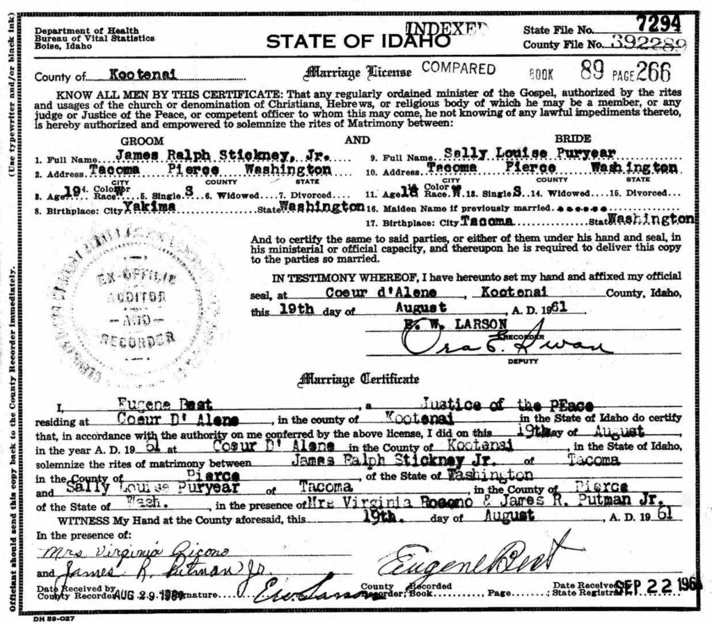Sallie Louise 18, married James Stickney Jr 19, on August 19, 1961 in Coeur D’ Alene Idaho. They were married for 15 years when James was hit by another car and passed away in July of 1976. He was a soldier in the Army at his time of passing.