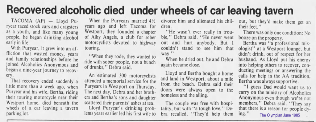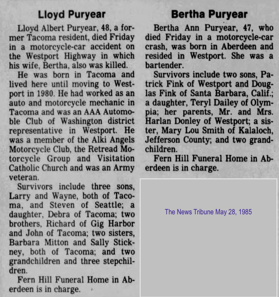 How sad. Lloyd and Bertha Puryear were hit by a drunk driver while riding their motorcycle Memorial Day weekend, May 28, 1985.