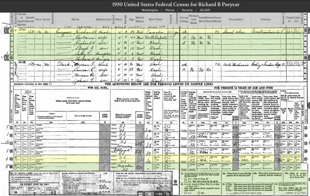 In this 1950 census, Richard and Barbara lived on Junett street in Tacoma, Washington. Richard was working as a shovel oiler at a construction company. Richard, Lloyd, and Sallie would be attending school.