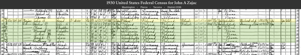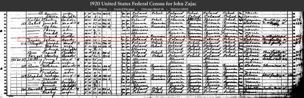 *There were seven John Zajac’s living in Chicago in the 1920s. I’m hoping because of his birth year and previous addresses that this is him. He was a border while working at the Box Factory as a laborer.