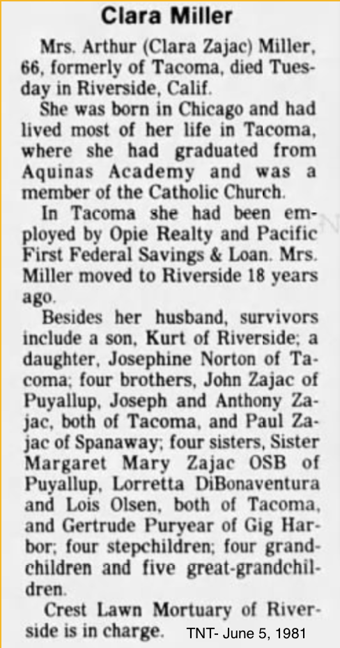 Clara Josephine [Zajac] Cannella marries Arthur Miller in Bremerton, Kitsap Co., WA, on February 26, 1955
