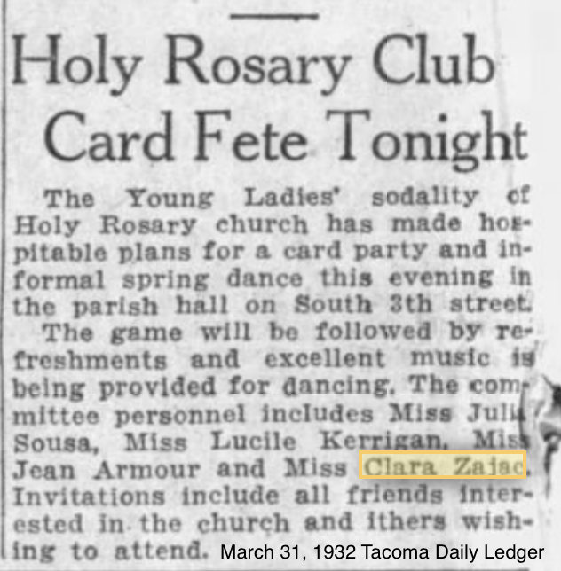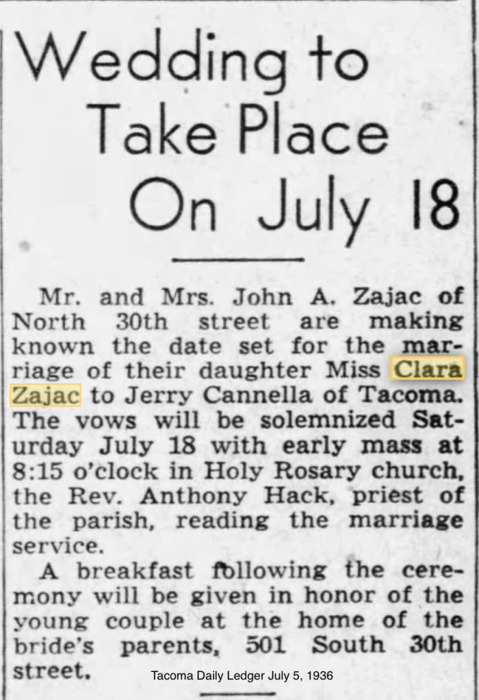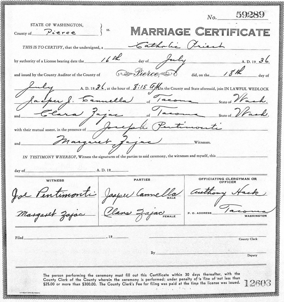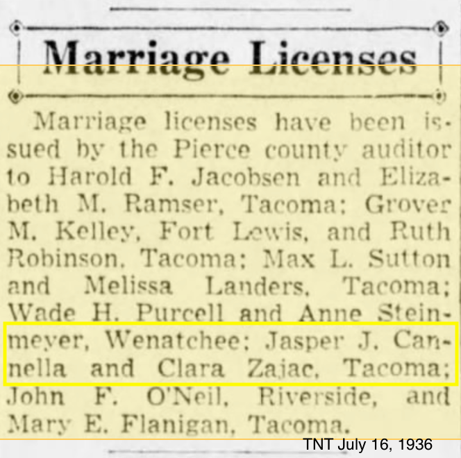 Clara Josephine marries Jasper J. Cannella on July 18, 1936, at Holy Rosary in Tacoma, Pierce County, Washington. Her sister Margaret signed as her witness.