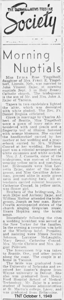 On October 1, 1949, John Vincent married Irma Rose Tingelhoff of Lincoln, Nebraska. They married at Holy Rosary and honeymooned in Seaside, Oregon.