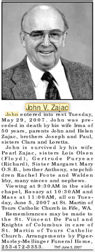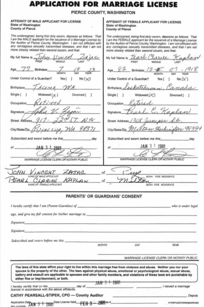 On January 31, 2001, John Vincent, 77, marries Pearl Clarice Kaplan, 82, in Pierce County, Washington. Both were previously widowed.