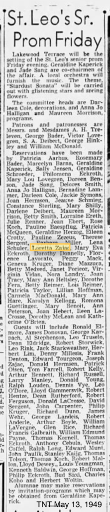 St. Leo’s Senior Prom. May 13, 1949. Attendees were Loretta and Joseph