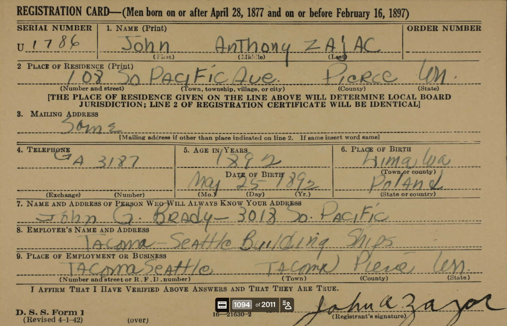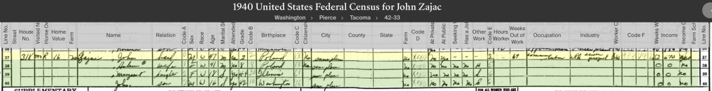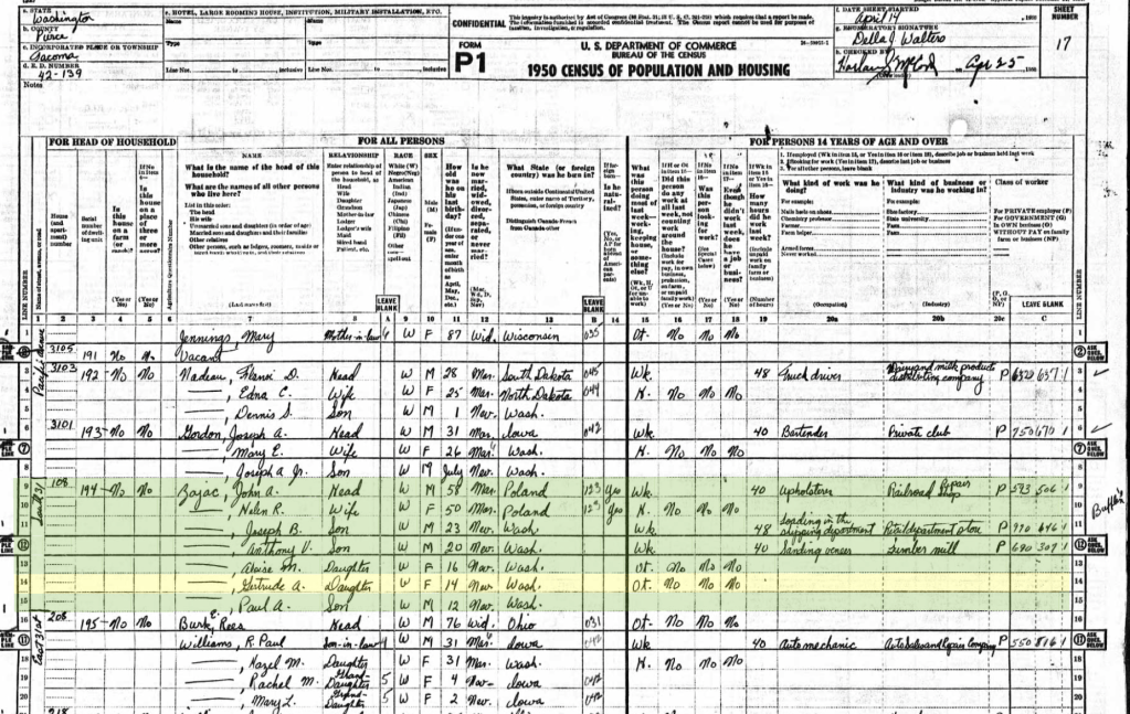 This is the last Census for the family until the 1960 census is released in April 2032. The house 108 S 31st street Tacoma is now where the I-5 freeway runs. John is an Upholster at the Railroad Repair shop. Joseph is a loader in the shipping department for a retail store. Anthony was sanding veneers (?) for the Lumber Mill. Lois, Gertrude, and Paul would be students.