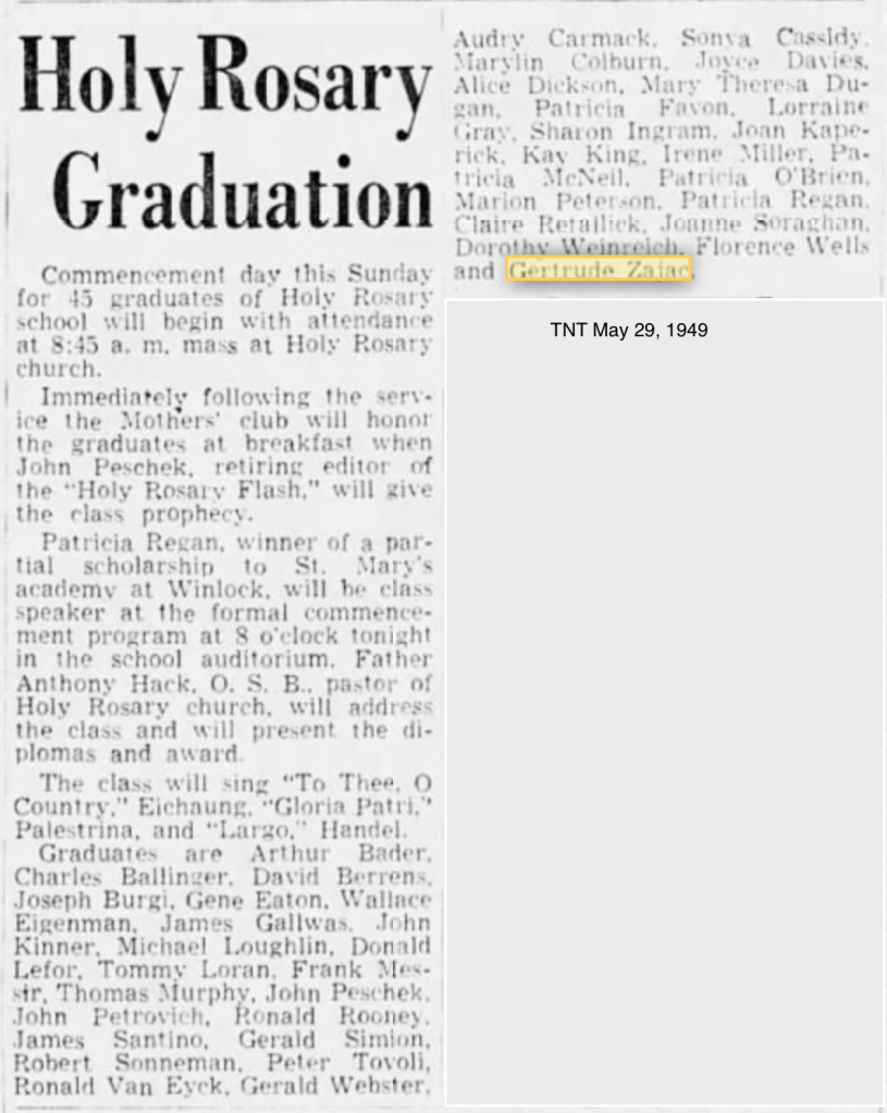 On May 29, 1949, Gertrude Ann graduates from Holy Rosary, Tacoma, Washington. The next step is high school at St. Leo’s.