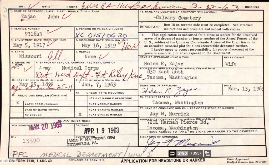 John A. Zajzc enlisted into the military on May 5, 1917 while living in Chicago. He was honorably discharged on May 16, 1919. His gravestone says MO PFC Med. Dept. WWI. Does anyone have any information or stories of his military service?