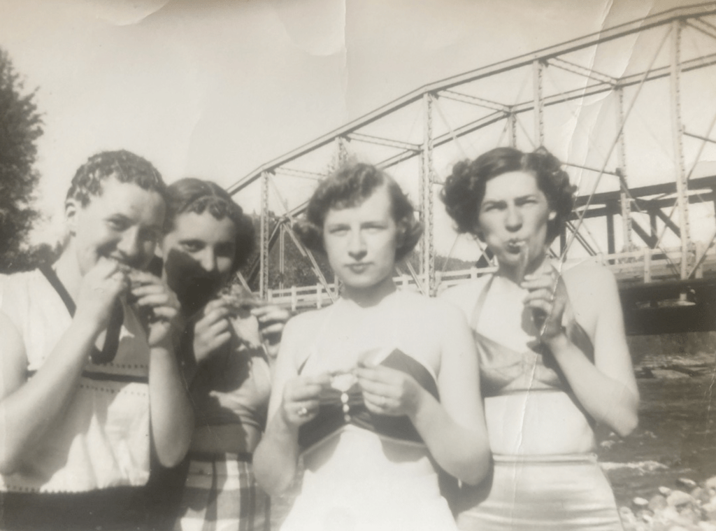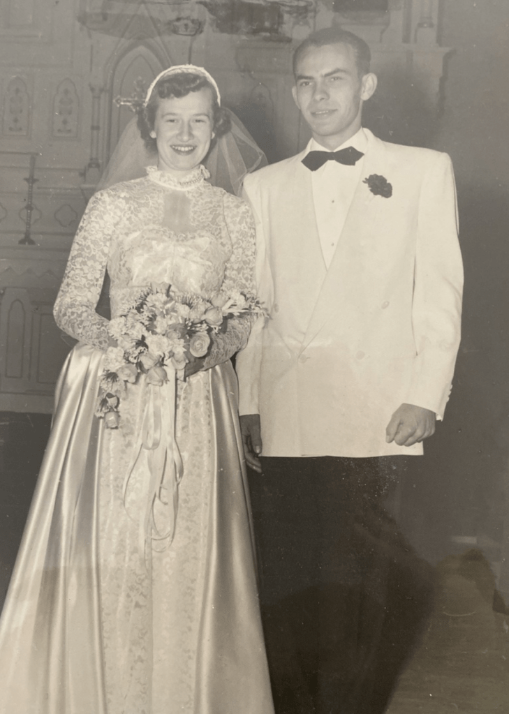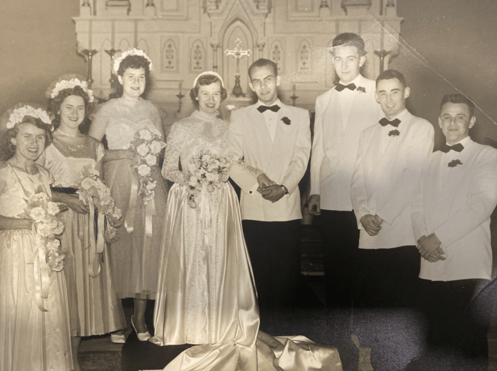 Grandpa Dick told me that he first saw Gertie on January 29, 1953, in the kitchen at Jim Jackson’s house. At the Valentine’s Day dance, he danced with her all night. He bought her an engagement ring right before she graduated high school. He told me that was scandalous. They were married on October 3, 1953, at Holy Rosary Tacoma, Washington. Gertie wore her sister Lois’s wedding dress, and Dick gave her a haircut for the big day. I think that’s so sweet!