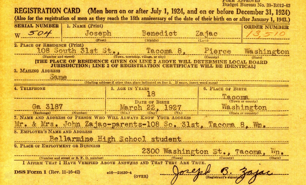John Vincent’s registration card January 29, 1946. He was 5 ft 8in, weighed 160lb, and had brown eyes and hair with a ruddy complexion. He lived at 108 South 31st Street, Tacoma, Washington, which is now part of I-5.