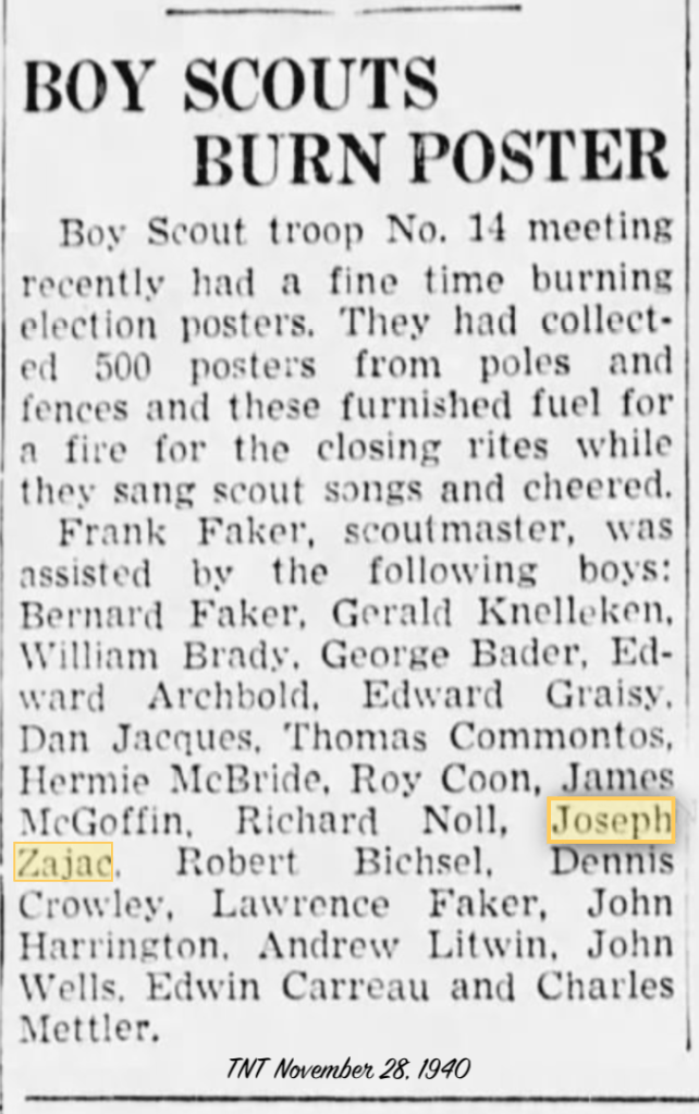 How fun! Joseph (13yo) and his Boy Scout troop collected and burnt 500 election posters. November 28, 1940